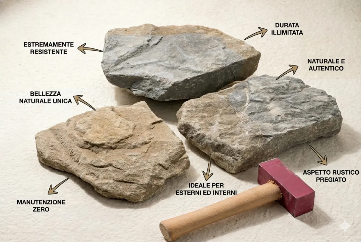 La vera pietra naturale non ha eguali, reagisce alla luce in modo dinamico, permette di avere una maggiore durabilità e trasmette un senso di autenticità unico.